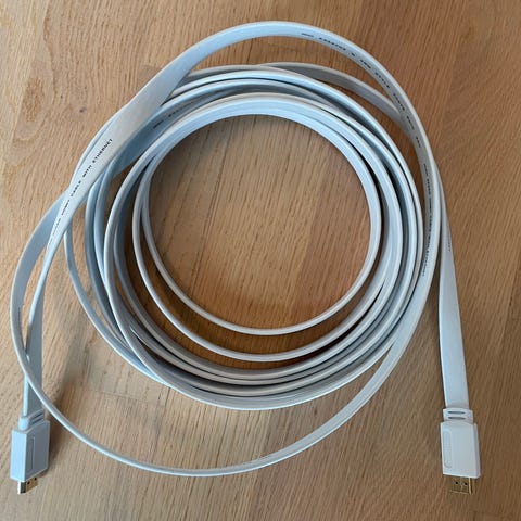 Deltaco High Speed HDMI-kabel med Ethernet i hvit farge. Kabelen har flate ledninger og HDMI-kontakter. Designet for å støtte høyhastighets dataoverføring med Ethernet-funksjonalitet. 15 meter lang