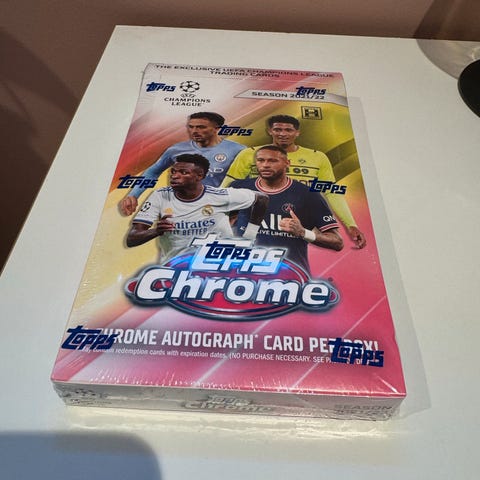 Topps Chrome Fotballkortpakke UEFA Champions League 2021-22 inneholder samleobjekter fra UEFA Champions League, UEFA Europa League og UEFA Conference League. Pakken inkluderer 1 Chrome autografkort per eske. Produktet er ment for samlere og fotballentusiaster.