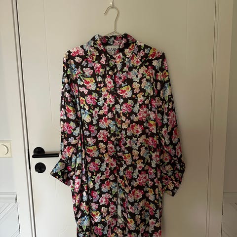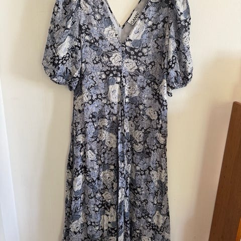 Kjole fra Ganni i størrelse medium. Fremstår som brukt med normal bruksslitasje. Inni ermene er det noe løse tråder (se bilder) synes ikke utenpå.