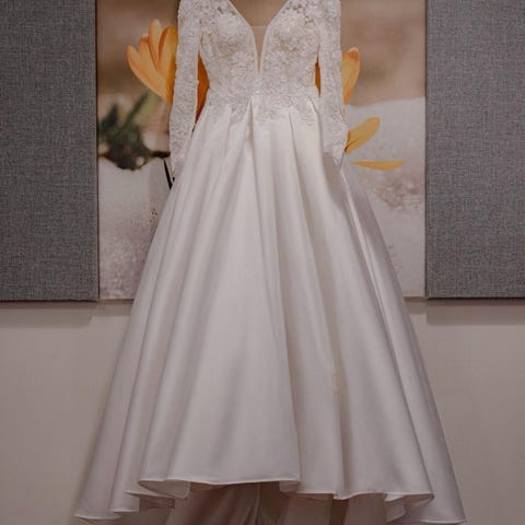 Kjolen har underskjørt og en del tyll for å gjøre den større (se de første bildene), men dette endte jeg med å fjerne da jeg ville ha splitt i kjolen (se de siste bildene). Dette medfølger og kan enkelt sys inn igjen.