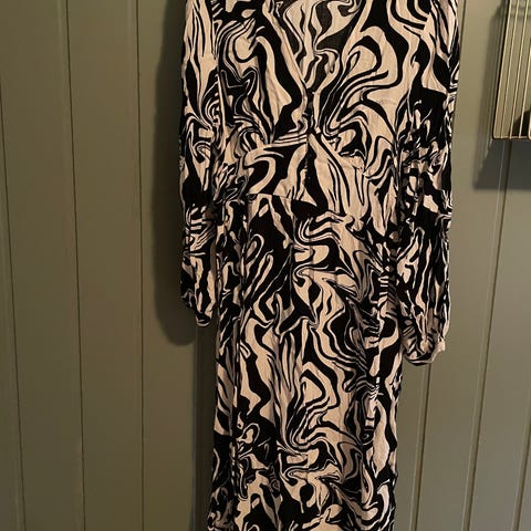 Søt, lett kjole med blå bakgrunn og hvitt mønster. Vaffelsøm over bysten.