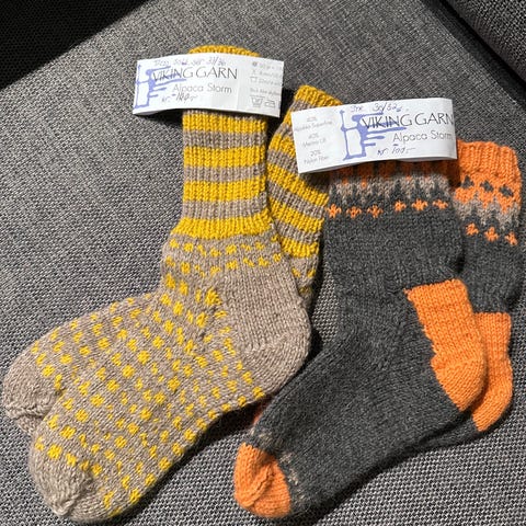 Jeg hjelper min strikkeglade mor å selge unna litt av det hun strikker. Strikkingen gjør godt for leddgikten, så det produseres mer enn hva barnebarn får brukt.