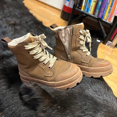 Skoene er i god stand, men høyre sko har en liten feil som vises på bildet.