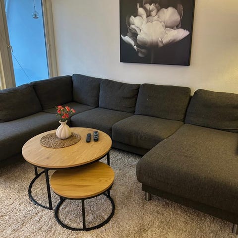Selger en stor og komfortabel U-sofa i grått stoff. Sofaen er pent brukt, uten skader eller slitasje utover normal bruk. Den har god sittekomfort og plass til mange.