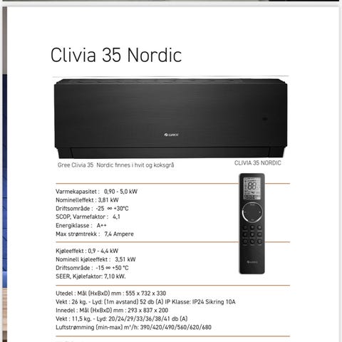• Lydnivå: 48 dB(A) (kjøling) / 64 dB(A) (lyd¬effekt)