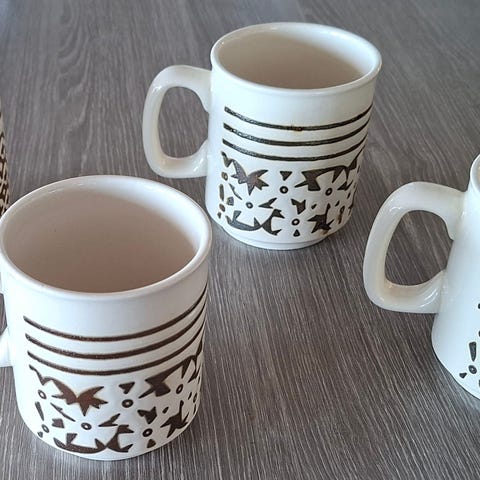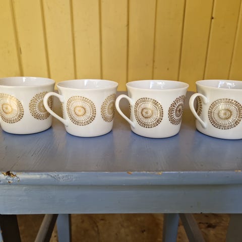 Engelske retro tekrus i nydelig farge og mønster. Høyde 9cm, diameter 8cm. Noen svake krakeleringer i bunn. Ellers i veldig god stand. Selges samlet 200kr.