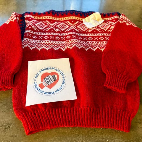 Selger en nydelig Marius-genser, håndstrikket i Lille Lerke fra Dale Garn – et garn av høy kvalitet som består av 53 % fin merinoull og 47 % egyptisk bomull. Dette gjør genseren ekstra myk, pustende og behagelig mot huden – perfekt for barn som ofte synes ull klør.