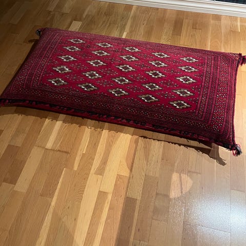 En putestol i kelim selges - deilig gulvstol å sitte lese eller slappe av på.
