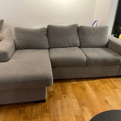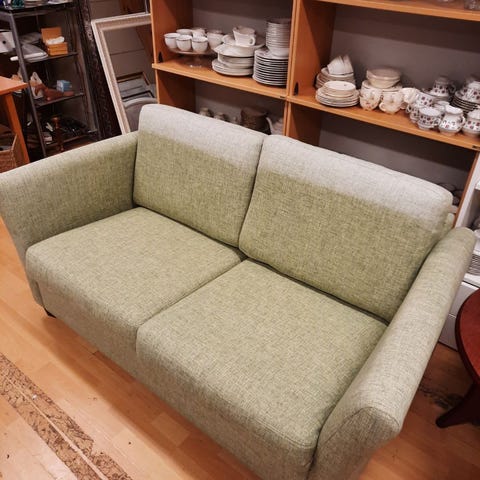 En solid 3-seters sofa med et godt, kraftig stoff i fargen beige/sand. Nypris 14500kr. Nyvasket, men noen bruksmerker( se bilde) veldig god å sitte i. Må hentes i Skien. Med bærehjelp da den er tung.