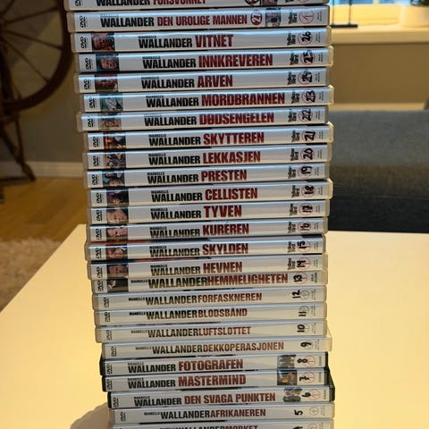 Mankells Wallander DVD box set featuring multiple episodes from the Wallander series. The set includes titles such as 'Sidste,' 'Afskytneren,' and 'Det Svage Led.' The DVDs are in standard case packaging suitable for collectors and fans of the crime drama series.