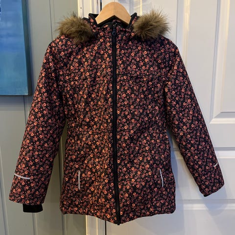 Jakken har hette med pelskant og er designet for jenter. Materialet er egnet for kalde værforhold,fin lengde.Brukt et par ganger.