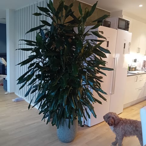 Dracena har store, grønne blader og krever lys, men ikke direkte sollys. En plante som lever lenge og gjør seg veldig i et rom!