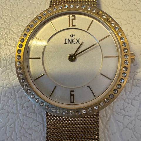 Pent brukt klokke selges. Nydelig dame klokke. Gullfarget. Batteriet må bare byttes. Den er bare ett par år gammel. Kjøpt på Bjørklund. Den tåler vann.