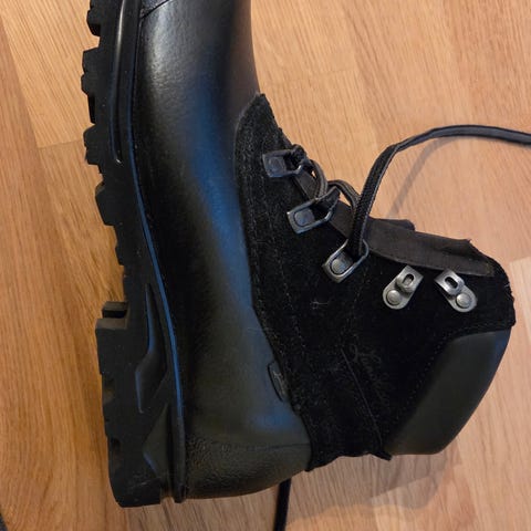 Skoene er grå og laget med Gore-Tex, noe som holder regn. Perfekt for høst, regn og vinter.