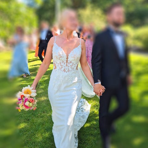 Selger min nydelige brudekjole. Kjolen er sydd inn og opp, så er også mesh delen på brystet/utringningen på originalen (se bilde på nettsiden) sydd igjen. Stroppene er også justert.
