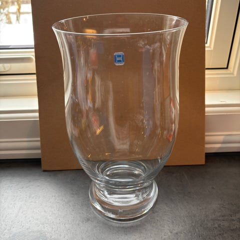 Hadeland Glassverk glassvase med en høyde på 20 cm. Vasen er laget av klart glass og har et gravert blomstermotiv som dekorasjon. Passer til bruk som dekorativ vase for blomster eller som interiørdetalj.