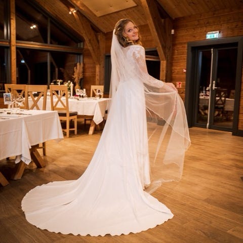 Selger også ubrukt slør (samme som på bildene av meg med kjolen på) som passer til kjolen, se mine annonser.