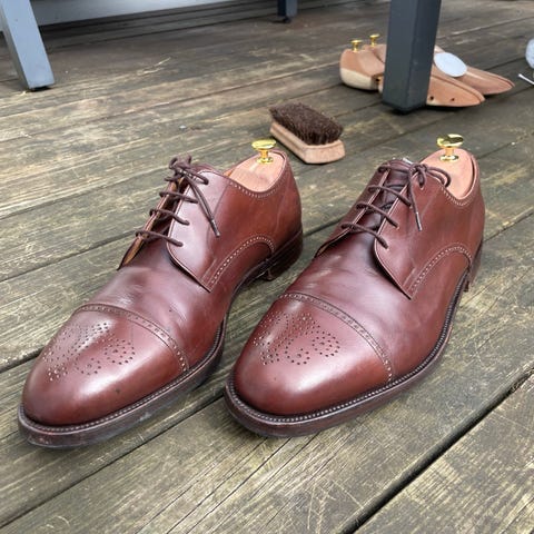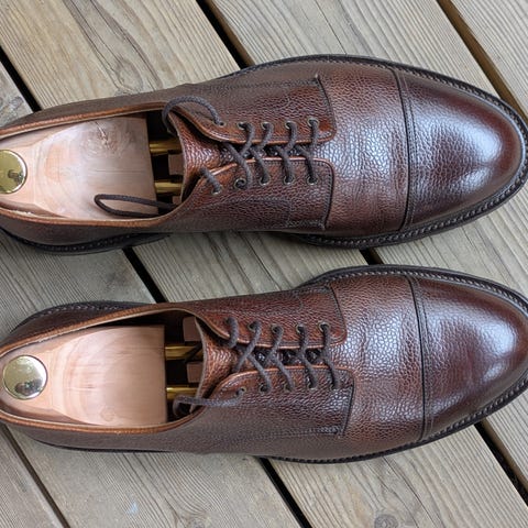 Dette er den ikoniske full-brogue derbyskoen fra C&J, kjent for sin tidløse eleganse og robust konstruksjon. Shell Cordovan er et av de mest eksklusive og slitesterke skinnene som finnes – med en vakker glans og patina som bare blir bedre med tiden. Skoene er laget i Northampton, England, med Goodyear-welted konstruksjon.