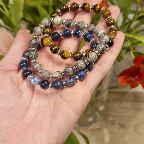 Armbåndet er fra merke Felix, det er av Sodalitt stener på strikk.