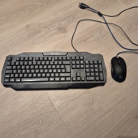 Sett med datatilbehør bestående av tastatur, mus og musematte. Produktene er i svart farge og har kablet tilkobling. Passer til bruk med PC eller bærbar datamaskin. Selges alene eller hver for seg. 450 for alt
