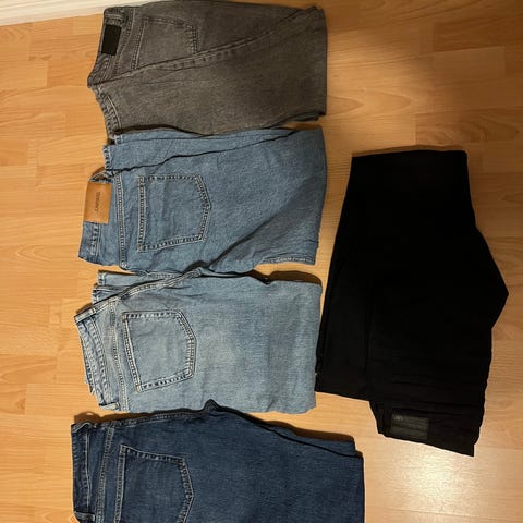 5 bukser- Levis, philippa K, Bikbok, never denim og monkl.