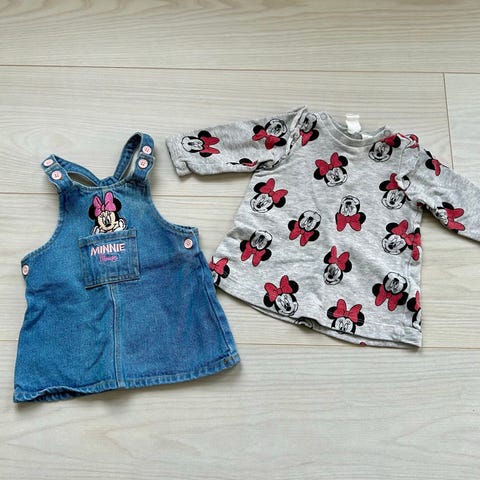 3 kjoler og en buksedress i størrelse 62. Kan ikke finne noen bruksmerker annet enn en liten rift på Minni mus, som du kan se på siste bilde. Det er ikke hull i stoffet.