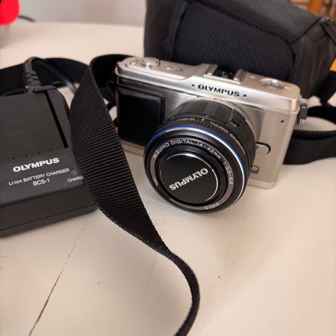 Canon EOS Rebel XSi speilreflekskamera med avtakbart EF-S 18-55mm zoomobjektiv. Kameraet har en LCD-skjerm for bildevisning og manuell kontroll av innstillinger. Objektivet dekker et brennviddeområde på 18-55mm og har autofokusfunksjon. Objektivet 2 dekker et brennviddeområde på 55-250mm og har autofokusfunksjon. Kameraet leveres med batterilader, veske og kamerarem.