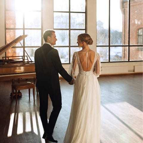 På brudebildene snakker vi høyde 162 cm + heler på 11 cm. Så totalt 173 cm her. Fullt mulig å sy opp dersom det trengs.