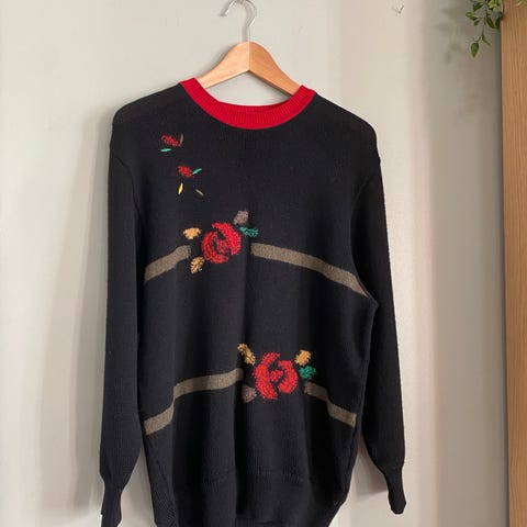Fargerik patchwork genser med broderi (Joye+Fun), str. S; veldig fin stand:) ingen flekker eller skader; 80% lammeull, 20% nylon; morsomt genser for hverdags:)