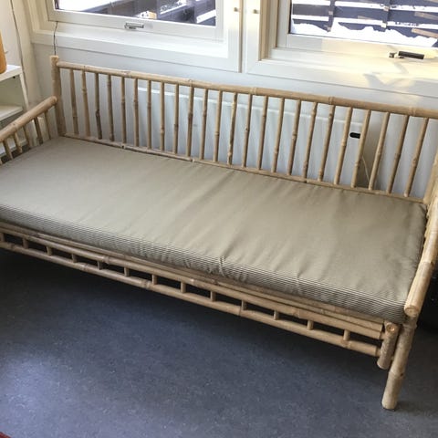Kjøpt for 3 år siden, og har stått beskyttet fra vær og vind på innglasset balkong. Vi har modifisert for å lage en hjørnesofa (var opprinnelig sofa og 2 stoler). Kan ikke se dette særlig godt, men de to delene er altså ikke festet sammen med mer enn strips. Har holdt seg på plass her, så fungerer supert som sofa 😊 Noen bruksmerker på putene, men antar det går bort i vask. Generelt veldig god stand 🌿