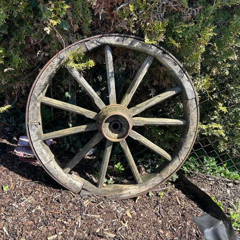 Hjulet er 85cm i diameter og er noe skadet i den ene delen.