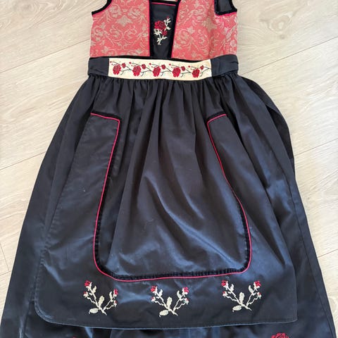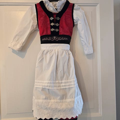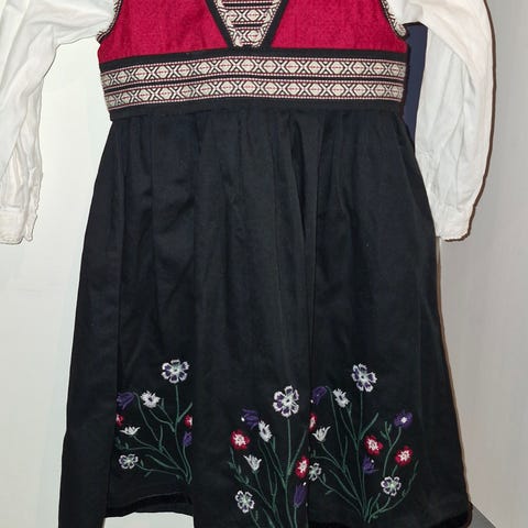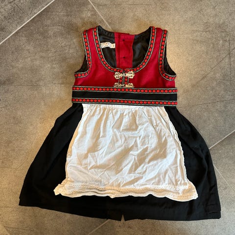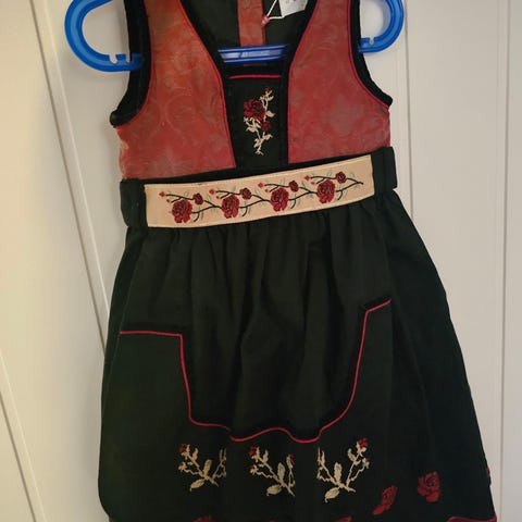 Name it flerfarget jentedrakt i størrelse 92. Kjolen har broderte rosemotiver på forstykket og et tilhørende lite tilbehørspose. Materialet består av en kombinasjon av tekstiler med mønster i oransje og svarte farger, med detaljer i fløyel. Lukking med trykknapper på skulder og rygg. Er en liten kosmetisk på ovredel se bilde,men dette fikses raskt med nål og tråd eller på maskin.