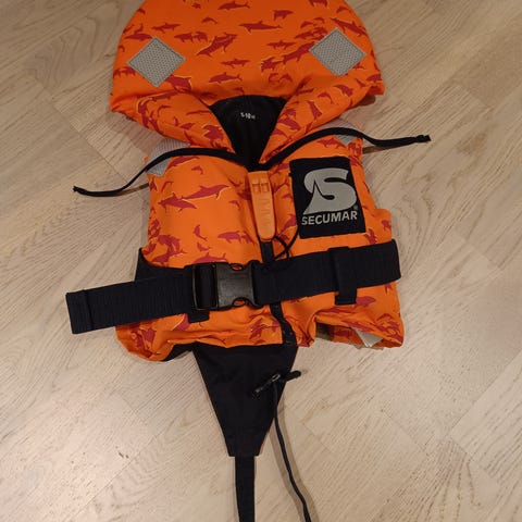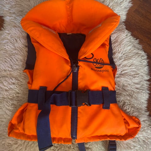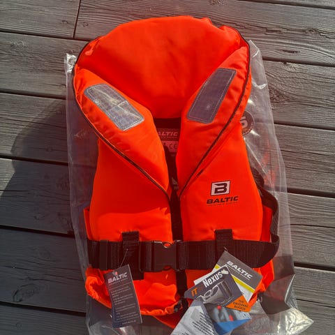 Redningsvesten er ikke brukt, da den ble for liten. Ligger i original pose.