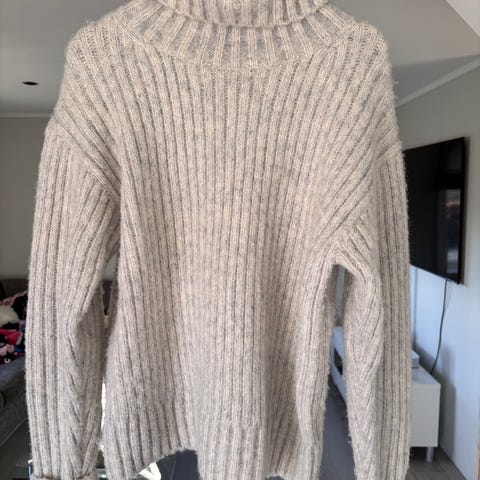 Deilig og myk genser med lekker flettemønster foran. 30% ull, 25% alpakka, 45 % nylon . Blir desverre ikke brukt. Mål: 69 cm målt på ryggen rett under ermene