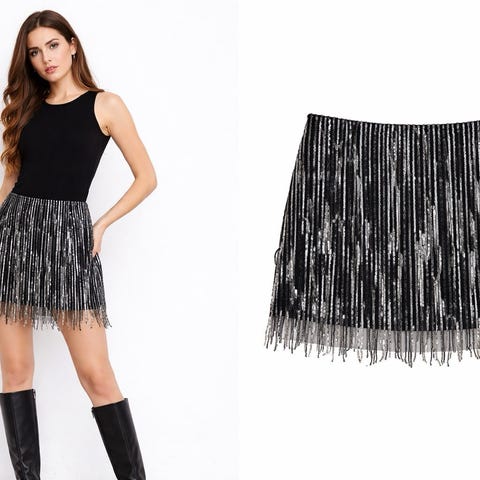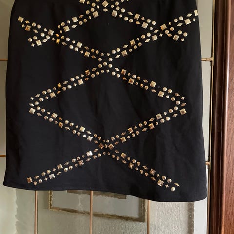 Zara svart skjørt i størrelse L. Skjørtet har dekorative hvite sømmer og glidelås på siden. Laget i et materiale som gir struktur og form. Passer til kvinner.