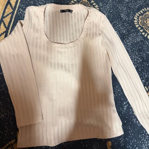 Shein Genser i hvit farge, størrelse M. Laget av ribbestrikket materiale med lange ermer og en lett bølget kant ved ermene og nederst. Passer for kvinner.