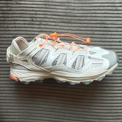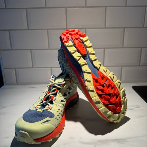 Hoka Mafate One One løpesko i størrelse 38, designet for løping. Skoene har en kombinasjon av beige og gul farger, med mesh-materiale for pusteevne og gummisåle for grep. Egnet for løpere som søker komfort og stabilitet.