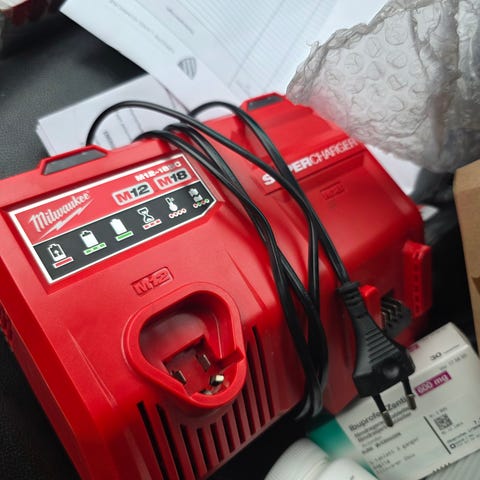 Ligger uåpnet i ekse. Her følger det 1stk M18 drill, 2x5Ah batterier og 1stk hurtiglader.