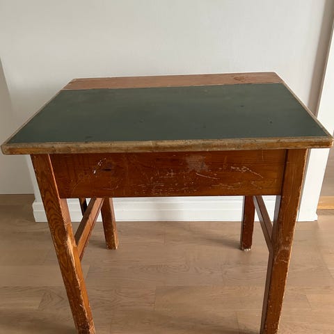 Selger denne gamle, ærverdige skrivepulten som var inventar på en barneskole for mange herrens år siden. Jeg har grunnet og malt den i den mørkerøde fargen Kilim fra Jotun. Ingen sjenerende lukt. Et par små riper i malingen, ellers er den i veldig god stand. Det er en hylle til oppbevaring under bordplaten, samt plass til litt skrivesaker på oversiden.