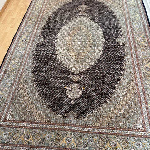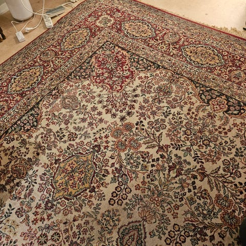 Stort og staselig teppe selges. Vi vet ingenting om det, men antar at det er ull. Teppet renses før levering til kjøper.