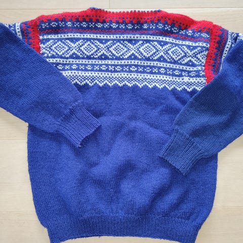 Genser strikket etter oppskrift fra den store guttestrikkeboka. Passer ca 4 år, se mål på bilde.
