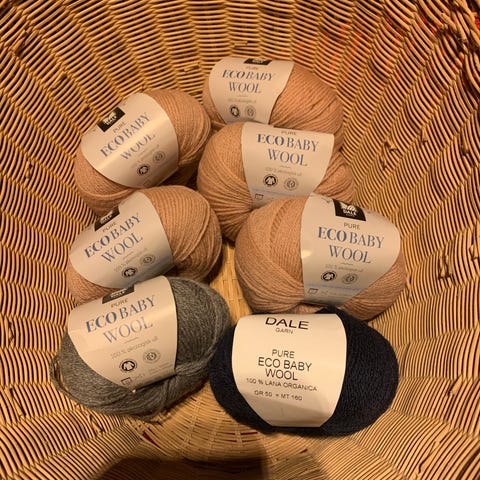 Fem hele nøster (50 gram) Pure Eco Baby Wool i farge 6070, pluss to rester som til sammen er på 50 gram. Samme innfarging. 100% økologisk ull.