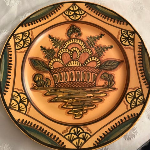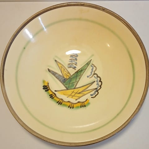 Flott håndmalt fat av Friestad signert. Ofte er disse fatene/ bollene litt slitte, men dette er i meget god stad. D=25 cm