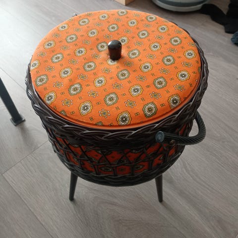 Original vintage 70-talls syskrin i rotting, blomstrete stoff