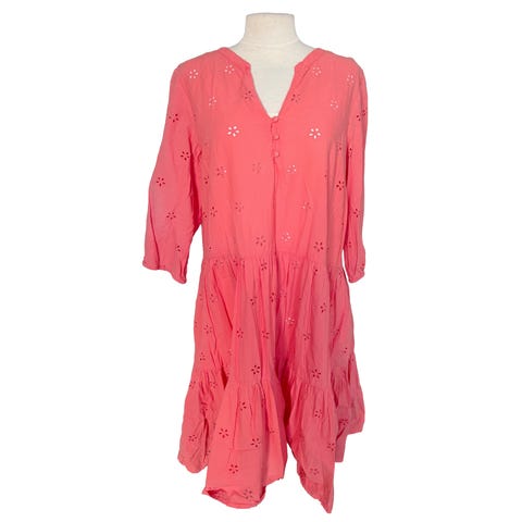 En kort, A-lineskåret kjole i bomullspoplin med ton i ton-broderier. Ledig passform med rund halsringning med snøring, V-formet åpning og supersmale knytebånd foran. Korte, raglanskårne ballongermer. Ufôret. Nypris 449,-. Selges for 220,-. Aldri brukt.