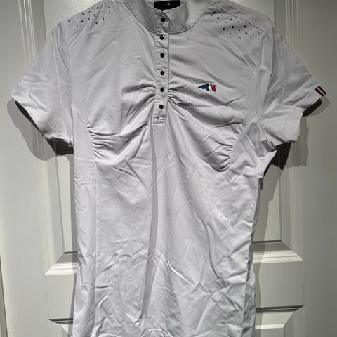 Selger en Equiline stevneskjorte med nydelige detaljer og bling på kragen. Den er navy med hvit krage og veldig luftig stoff. Ta gjerne kontakt og kom gjerne med bud, så kan vi se på det :)
