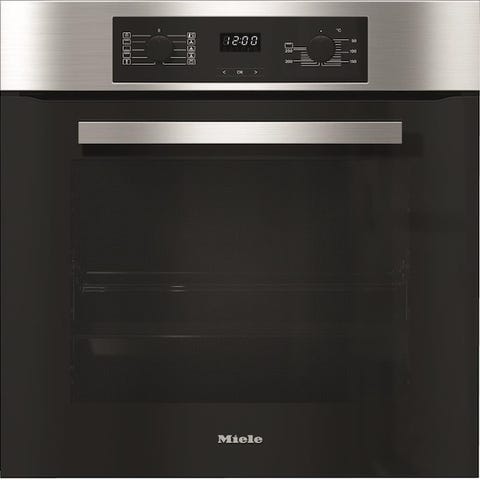 Miele innbygningskomfyr i normal størrelse med sort farge. Ovnen har mekaniske brytere for temperatur- og funksjonsvalg. Digitalt display for klokke og tidsur. Leveres med stekebrett og bruksanvisning. En av to hengsler er røket så døren holder seg ikke oppe av seg selv, pakning bør byttes. Eller fungerer den svært godt til mye ulik matlaging. Alle funksjoner fungerer deriblant grill, varmluft, over- undervarme og timing.
