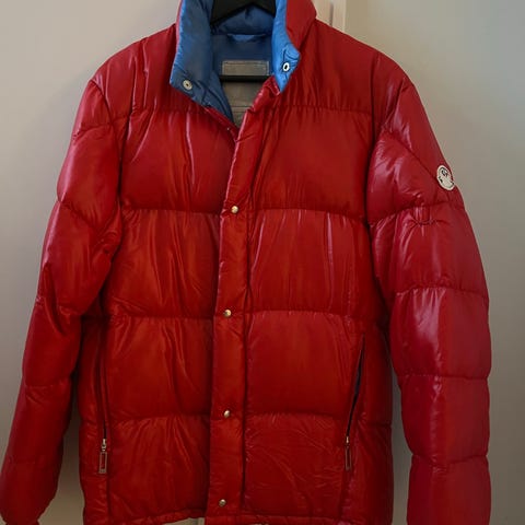 Mørkeblå Moncler dunjakke størrelse T 2 (ca størrelse M) fra slutten av åttitallet. Jakken har rødt for på innsiden. MÅ REPARERES, se bilder.