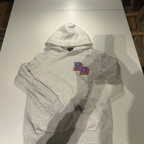 H&M Basics hettegenser i lys brun farge, størrelse S. Genseren har hette med snor og kengurulomme foran. Materialet er ikke spesifisert, men genseren er en del av H&M Basics-serien.