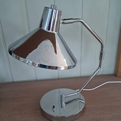 Nydelig og stilren lampe. Flott skjerm, også innvendig med glatt sølvfarget som gir en eksklusiv effekt. H: 61 cm. Har vært nedpakket og ikke vært i brukt. God pris for flott lampe !